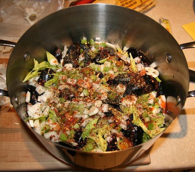 - Clean and rinse mussels sorting out the undesirables, and place in large pot. Pour in bottle of beer, add remaining ingredients. Swirl pot around a little to mix things up.